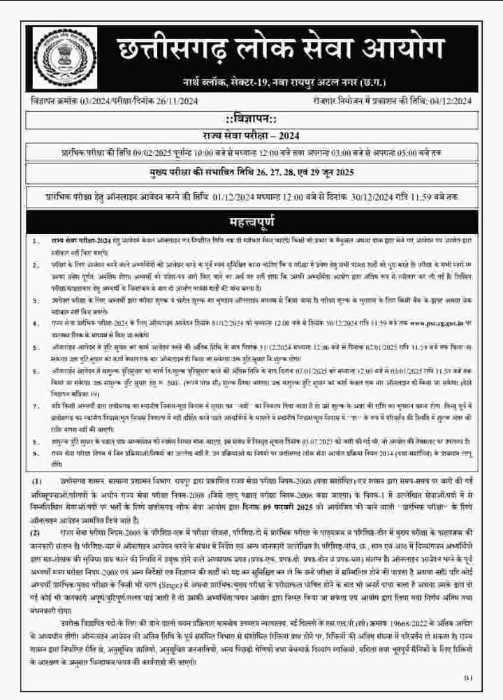 रायपुर। छत्तीसगढ़ लोक सेवा आयोग (CGPSC) ने राज्य सेवा परीक्षा 2024 (PCS) का नोटिफिकेशन (Chhattisgarh PCS Notification) जारी कर दिया है। पीसीएस 2024 के जरिए 246 पदों पर भर्ती के लिए परीक्षा होगी। ऑनलाइन फॉर्म एक दिसंबर 2024 की दोपहर 12 बजे से 30 दिसंबर 2024 रात्रि 11:59 बजे तक भरे जाएंगे।