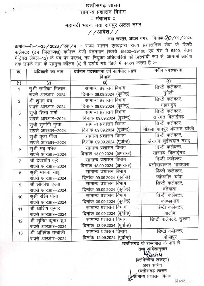 मोहला-मानपुर – छत्तीसगढ़ लोक सेवा आयोग 2022 बैच की शुभांगी गुप्ता ने नवीन जिला मोहला मानपुर अंबागढ़ चौकी में डिप्टी कलेक्टर पद का पदभार ग्रहण किया है। आपको बता दे की शुभांगी गुप्ता सीजीपीएससी 2022 में 5वा रैंक प्राप्त कर डिप्टी कलेक्टर के पद में चयनित हुई। इससे पहले इनका चयन संयुक्त रक्षा सेवा परीक्षा cds में भी हुआ था।
