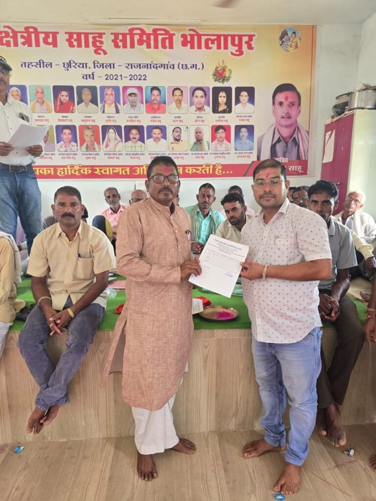 राजनांदगांव।  छुरिया/तहसील साहू संघ छुरिया द्वारा परिक्षेत्र साहू समिति भोलापुर के  निर्वाचन हेतू  नियुक्त निर्वाचन अधिकारी श्री सुकृत साहू  संयोजक कबीर  मंच तहसील छुरिया एवं सहायक निर्वाचन अधिकारी किशून साहू संयोजक अधिकारी कर्मचारी प्रकोष्ठ तहसील छुरिया के द्वारा दिनांक 21.9.2025 दिन रविवार को मां कर्मा भवन भोलापुर परिक्षेत्र भोलापुर में चुनाव संपन्न कराया गया।