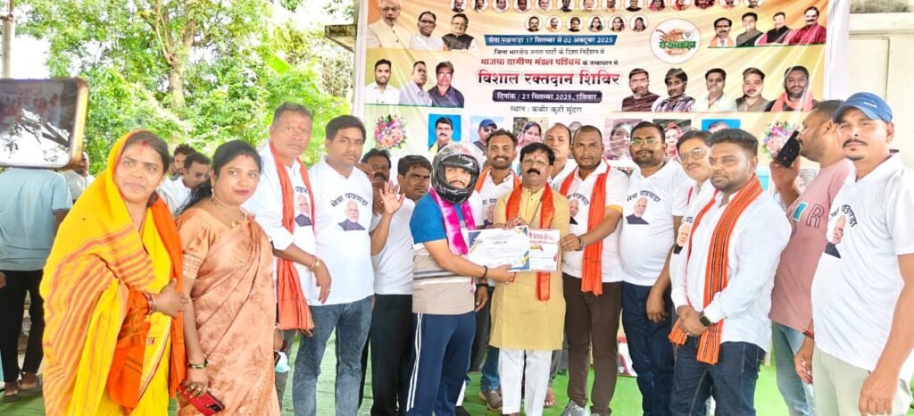 राजनांदगांव।सेवा पखवाड़ा भाजपा ग्रामीण पश्चिम मंडल द्वारा देश के यशस्वी प्रधानमंत्री नरेंद्र मोदी जी के जन्म दिवस के अवसर में विशाल रक्तदान शिविर कबीर कुटी आश्रम ग्राम सुंदरा में 21 सितंबर को आयोजन किया गया।