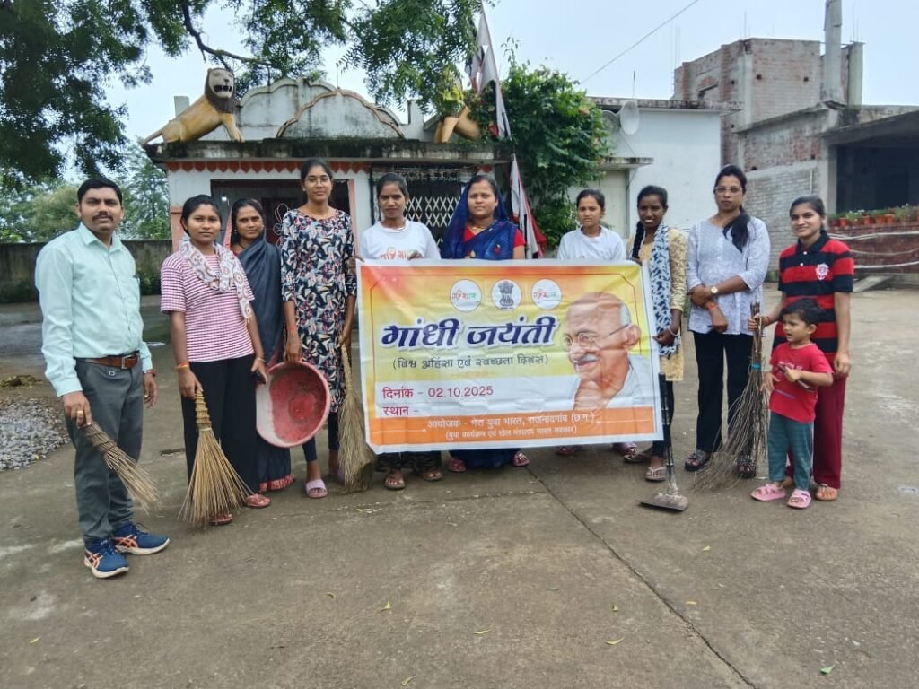 मेरा युवा भारत राजनांदगांव ( युवा कार्यक्रम एवं खेल मंत्रालय , भारत सरकार) एवं जिला युवा अधिकारी सुभजित डे लेखापाल तपन साहू के नेतृत्व में महात्मा गांधी के जन्मतिथि के उपलक्ष में राजनांदगांव विकासखंड के बुंदेलिकला गांव में मेरा युवा भारत के स्वयंसेवकों के माध्यम से गांधी जी के तेल चित्र पर फूल अर्पित कर उनका स्मरण किया गया एवं स्वच्छता की शपथ ली गई उसके पश्चात गांव के मंदिर परिसर एवं आस पास के इलाकों को साफ सफाई कर गांव को स्वच्छ रखने की शपथ ली गयी|