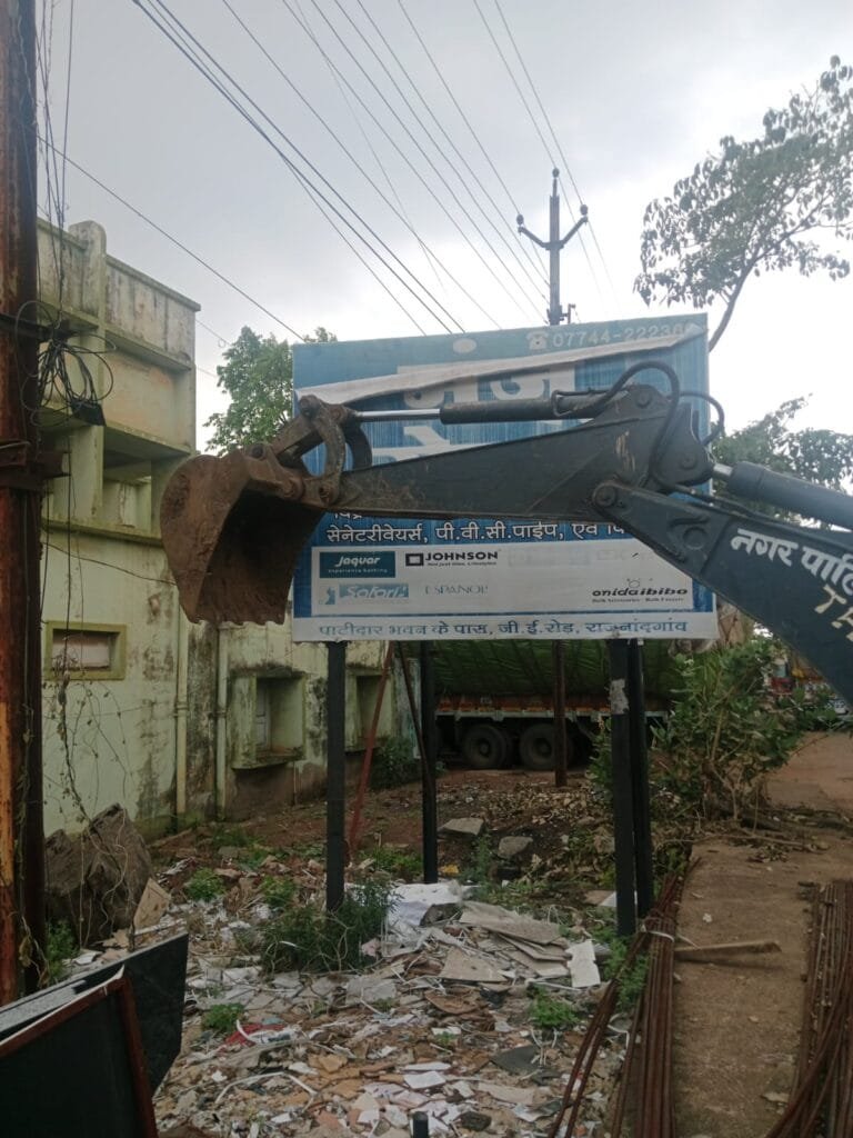 इस संबंध में निरीक्षण के दौरान यातायात बाधित होने वाले बोर्ड एवं अवैध रूप से लगे बोर्ड को हटाने संबंधितों को नोटिस के माध्यम से सूचित करने एवं हटाने होडिंग बोर्ड के प्रभारी अधिकारी श्री अशोक चैबे को निर्देशित किया गया था। किन्तु कतिपय लोगों के द्वारा अवैध होर्डिग्स व बोर्ड नही हटाया गया। जिसे आज निगम की टीम ने कार्यवाही करते हुये जी.ई.रोड में लगे आम्बेडकर चैक से रायपुर नाका तक लगे अवैध विज्ञापन होडिग्स बोर्ड हटाया गया। उक्त कार्यवाही निरंतर जारी रहेगी।