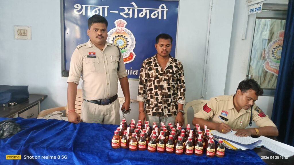 राजनांदगांव (सोमनी)। जिले में नशे के खिलाफ चलाए जा रहे अभियान के तहत सोमनी थाना पुलिस ने अवैध शराब बिक्री करने वाले एक आरोपी को गिरफ्तार किया है। पुलिस ने आरोपी के कब्जे से बड़ी मात्रा में देशी शराब जब्त की है।पुलिस से मिली जानकारी के अनुसार, 25 अप्रैल 2026 की सुबह मुखबिर से सूचना मिली कि ग्राम ककरेल रोड तिराहा के पास एक युवक अवैध रूप से शराब बेच रहा है।
