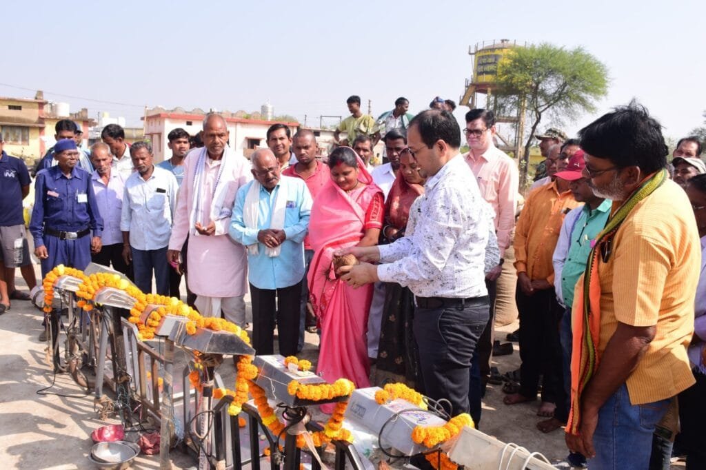 – कलेक्टर एवं किसानों ने इलेक्ट्रानिक कांटा बाट मशीन में धान का बारदाना रखकर पूजा-अर्चना की