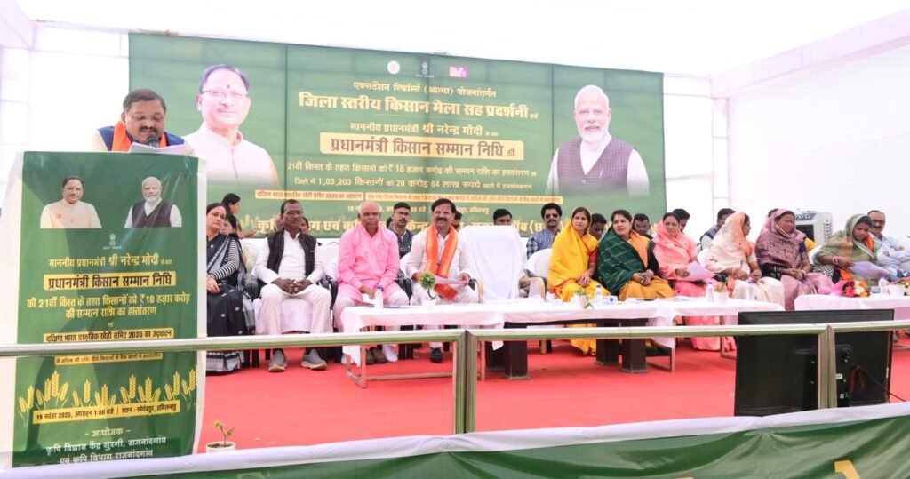 राजनांदगांव 19 नवम्बर 2025। प्रधानमंत्री श्री नरेन्द्र मोदी ने कोयम्बटूर तमिलनाडु से प्रधानमंत्री किसान सम्मान निधि की 21वीं किस्त के रूप में जिले के 1 लाख 3 हजार 203 किसानों को 20 करोड़ 64 लाख रूपए का भुगतान आधार बेस्ट प्रणाली के माध्यम से किया। सांसद श्री संतोष पाण्डेय कृषि विज्ञान केन्द्र सुरगी में आयोजित कार्यक्रम से वर्चुअल माध्यम से जुड़े रहे। सांसद श्री संतोष पाण्डेय ने किसानों को शासन की योजनाओं का अधिक से अधिक लाभ लेकर उत्पादन में वृद्धि के लिए प्रेरित किया। अध्यक्ष जिला पंचायत श्रीमती किरण वैष्णव और समाजसेवी श्री कोमल सिंह राजपूत ने भी किसानों को आधुनिक तकनीक का उपयोग करते हुए खेती करने के लिए प्रेरित किया। वरिष्ठ वैज्ञानिक एवं प्रमुख डॉ. गुंजन झा ने केन्द्र की गतिविधियों की जानकारी दी।