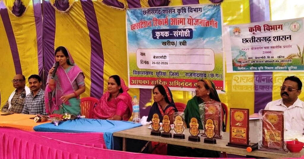 राजनांदगांव 27 फरवरी 2026। कृषि विभाग द्वारा एक्सटेंशन रिफार्म आत्मा योजनांतर्गत छुरिया विकासखंड के ग्राम बेलरगोंदी में कृषक संगोष्ठी का आयोजन किया गया। कार्यक्रम में जिला पंचायत अध्यक्ष श्रीमती किरण वैष्णव, जनपद पंचायत सदस्य श्रीमती चंद्रिका वर्मा विशेष रूप से उपस्थित थे। कार्यक्रम में किसानों को आगामी खरीफ फसल के लिए आवश्यक मार्गदर्शन किया गया। इस दौरान जनप्रतिनिधियों एवं अधिकारियों द्वारा ग्राम बेलरगोदी के किसान श्री जयप्रकाश वर्मा के खेतों में पहुंचकर चना फसल का अवलोकन किया।