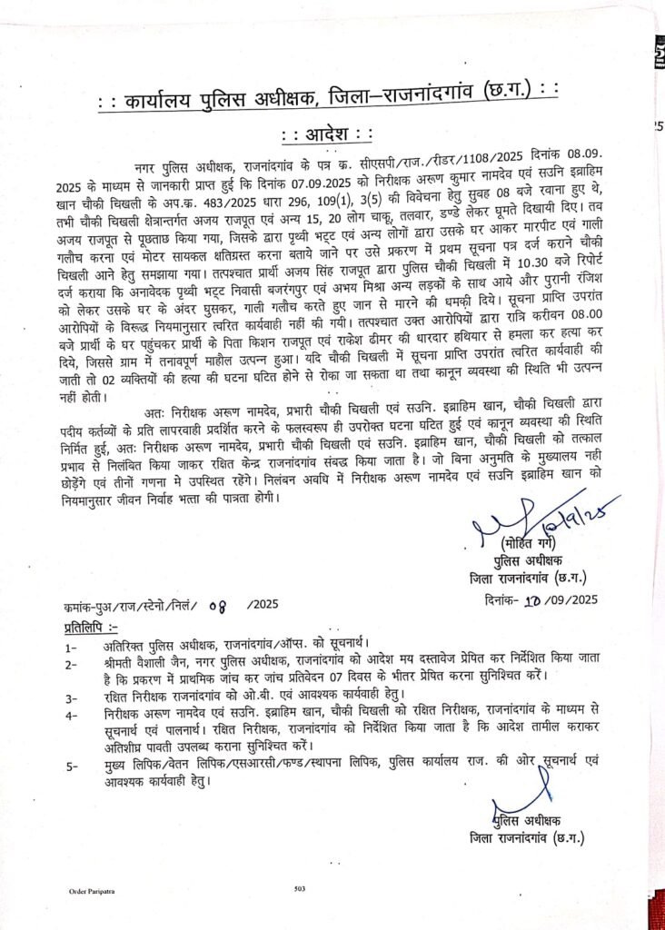 राजनांदगांव। जिले के थाना चिखली क्षेत्र में 7 सितंबर 2025 की सुबह हुई गंभीर घटना के बाद पुलिस प्रशासन ने बड़ी कार्रवाई करते हुए चिखली पुलिस चौकी प्रभारी और सहायक उप निरीक्षक को निलंबित कर दिया। मामला तब सामने आया जब निरीक्षक अरुण कुमार नामदेव, सउनि इब्राहीम खान और सउनि सजिन इब्राहीम खान की लापरवाही के चलते अपराधियों ने खुलेआम हत्या की घटना को अंजाम दिया।