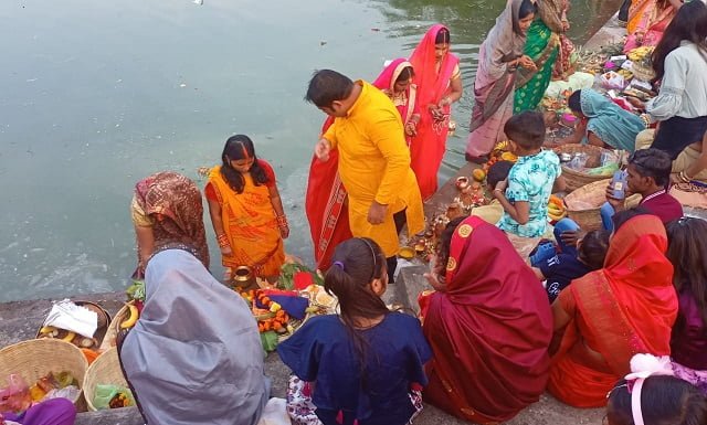 इस मौके पर व्रती महिलाए सोलह श्रृंगार कर तालाब घाट पहुची हुई थी और छठी माता की विधी विधान से पूजा अर्चना कर भगवान सूर्य को अर्ध दिया और सुख समृध्दि की कामना की  इस अवसर  पर जगमगाते दीप के साथ भक्तो की उपस्थिती से तालाब की मनोरम  छंटा बिखरी रही ।लोग इस दौरान एक दूसरे को छठ पर्व की शुभकामनाएं एव बधाई दी ।