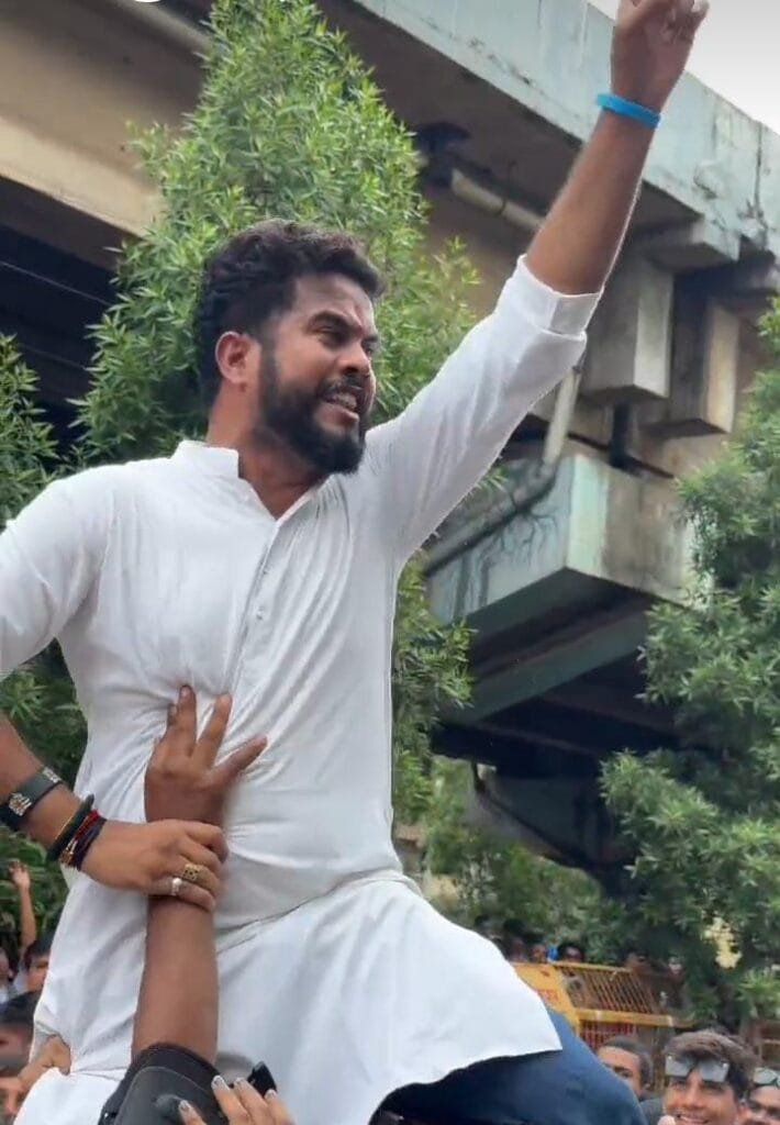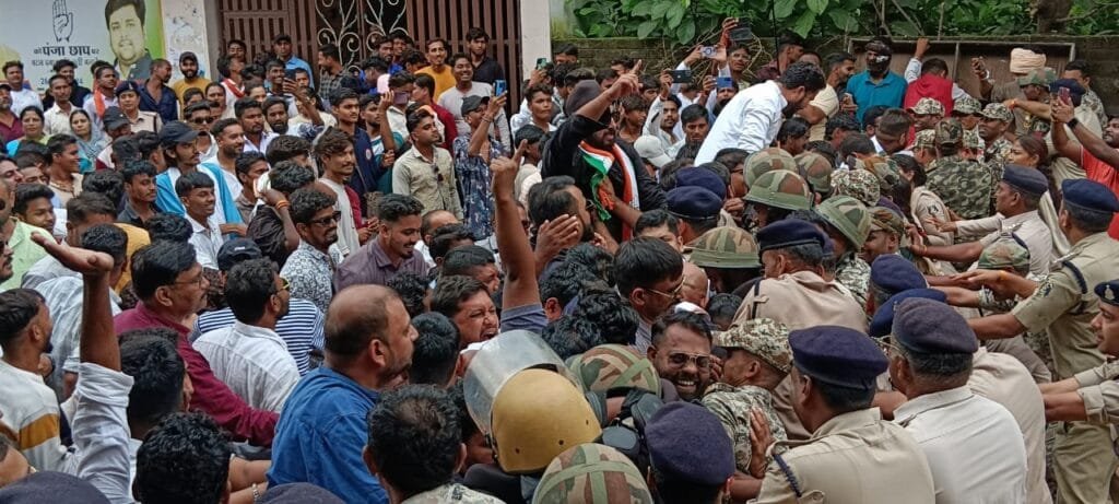 पुलिस प्रशासन की इतनी अधिक व्यवस्था के चलते आंदोलन उग्र रूप लिया तीखी नोकझोक के पश्चात सैकड़ो युवा कांग्रेस पदाधिकारी एवं कार्यकर्ताओं ने अपनी गिरफ्तारी दर्ज करायी गिरफ्तारी होते ही पुलिस प्रशासन होश में और गृह मंत्री विजय शर्मा मुर्दाबाद के नारे युवा कांग्रेसियों द्वारा लगाए गये अंततः युवा कांग्रेस पदाधिकारी द्वारा घेरा बनाकर रघुपति राघव राजा राम का भजन गा कर अपनी गिरफ्तारी स्वीकार की