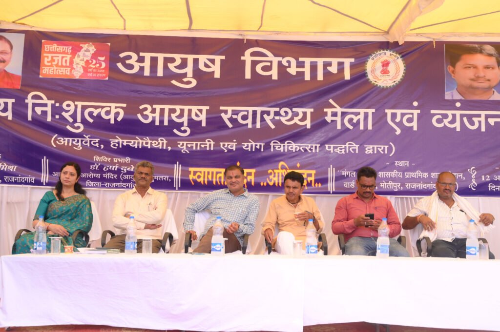 राजनांदगांव 13 अक्टूबर 2025। छत्तीसगढ़ राज्य गठन के 25 वर्ष पूर्ण होने के उपलक्ष्य में छत्तीसगढ़ रजत महोत्सव के अवसर पर मंगल भवन शासकीय प्राथमिक शाला मैदान मोतीपुर में एक दिवसीय जिला स्तरीय नि:शुल्क आयुष स्वास्थ्य मेला एवं व्यंजन प्रदर्शनी का आयोजन किया गया। संचालनालय आयुष छत्तीसगढ़ रायपुर के निर्देशानुसार डॉ. शिल्पा मिश्रा जिला आयुष अधिकारी के मार्गदर्शन में  आयुर्वेद, होम्योपैथी, यूनानी एवं योग चिकित्सा पद्धति  से स्वास्थ्य जांच एवं दवाईयों का वितरण किया गया। कार्यक्रम में महावीर कॉलेज ऑफ आयुर्वेद सांईस सुंदरा, राजनांदगांव के छात्रों द्वारा स्वास्थ्य के प्रति जागरूक रहने से संबंधित नुक्कड़ नाटक का प्रदर्शन तथा योगा वेलनेस सेन्टर राजनांदगांव एवं आयुष्मान आरोग्य मंदिर (आयुष), पदुमतरा प्रभारी के माध्यम से बच्चों एवं महिलाओं द्वारा योग नृत्य का प्रतियोगिता प्रदर्शन किया गया।