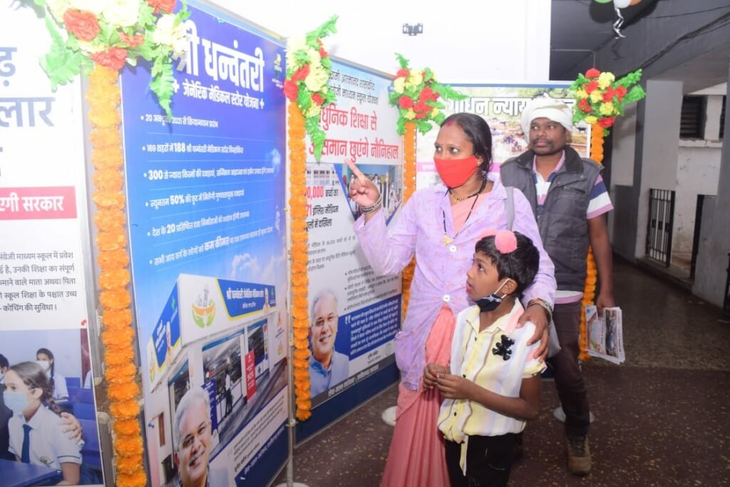 राजनांदगांव 18 दिसम्बर 2021। शासन के 3 वर्ष पूर्ण होने के अवसर पर जनसंपर्क विभाग द्वारा कलेक्टोरेट में आयोजित जिला स्तरीय फोटो प्रदर्शनी को देखने आज जनसामान्य बड़ी संख्या में पहुंचे। अंबागढ़ चौकी के ग्राम मुरेठीटोला से आई श्रीमती शीला कुरेटी अपनी बिटिया अनन्या को फोटो प्रदर्शनी दिखाने लेकर आई थी। उन्होंने शासन के स्वामी आत्मानंद स्कूल योजना एवं महतारी दुलार योजना की बहुत प्रशंसा की।