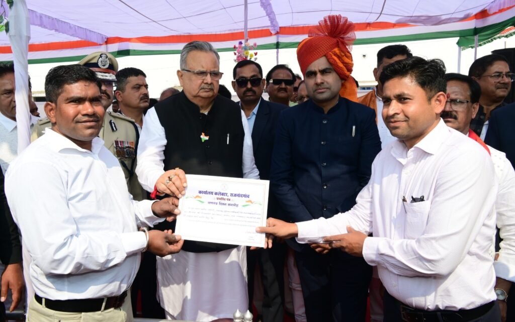 राजनांदगांव 26 जनवरी 2026। गणतंत्र दिवस के अवसर पर दिग्विजय स्टेडियम राजनांदगांव में आयोजित जिला स्तरीय मुख्य समारोह में मुख्य अतिथि विधानसभा अध्यक्ष डॉ. रमन सिंह ने उत्कृष्ट कार्य के लिए जनसंपर्क विभाग के सहायक सूचना अधिकारी श्री प्रवीण रंगारी एवं भृत्य श्री भूपेन्द्र साहू को प्रतीक चिन्ह एवं प्रशस्ति पत्र प्रदान कर सम्मानित किया। उल्लेखनीय है कि जनसंपर्क विभाग के सहायक सूचना अधिकारी श्री प्रवीण रंगारी को शासन की योजनाओं का प्रचार-प्रसार एवं समाचार कव्हरेज सहित अन्य उत्कृष्ट कार्य के लिए सम्मानित किया गया। इस तरह जनसंपर्क विभाग के भृत्य श्री भूपेन्द्र साहू को कार्यालयीन कार्य में तत्परता एवं सक्रियता से कार्य करने के लिए सम्मानित किया गया।