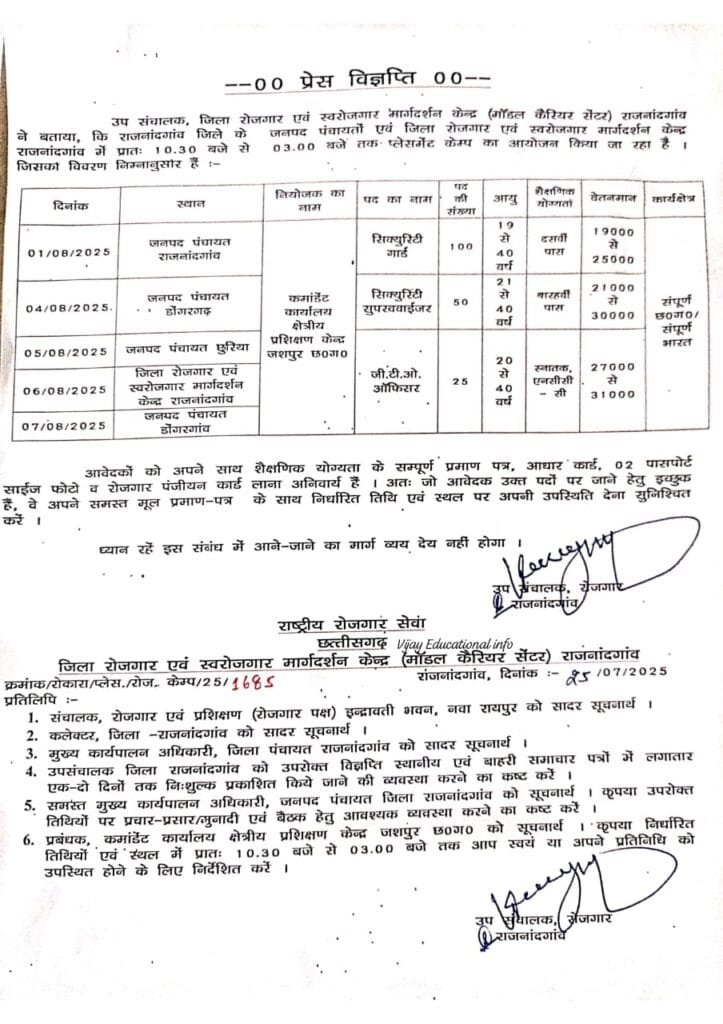 1 अगस्त 2025: जनपद पंचायत राजनांदगांव में सिरपुरपुड़ी गार्ड के लिए 100 पदों पर भर्ती। योग्यता 10वीं पास, वेतन ₹19,000 से ₹25,000।