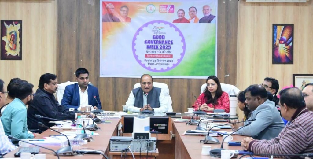 राजनांदगांव 23 दिसम्बर 2025। सुशासन सप्ताह अंतर्गत प्रशासन गांव की ओर अभियान के तहत आज कलेक्टोरेट सभाकक्ष में तत्कालीन कलेक्टर श्री अशोक अग्रवाल ने सभी अधिकारियों को मार्गदर्शन दिया। श्री अशोक अग्रवाल ने कहा कि राजनांदगांव जिले में टीम वर्क में उम्दा कार्य हो रहे हंै। उन्होंने कहा कि सुशासन सप्ताह में शासन की योजनाओं का लाभ जनसामान्य को अधिक से अधिक मिले। उन्होंने जल जीवन मिशन अंतर्गत जल संचय के लिए राष्ट्रीय स्तर पर पुरस्कार मिलने पर कलेक्टर एवं जिला पंचायत सीईओ को हार्दिक बधाई दी।
