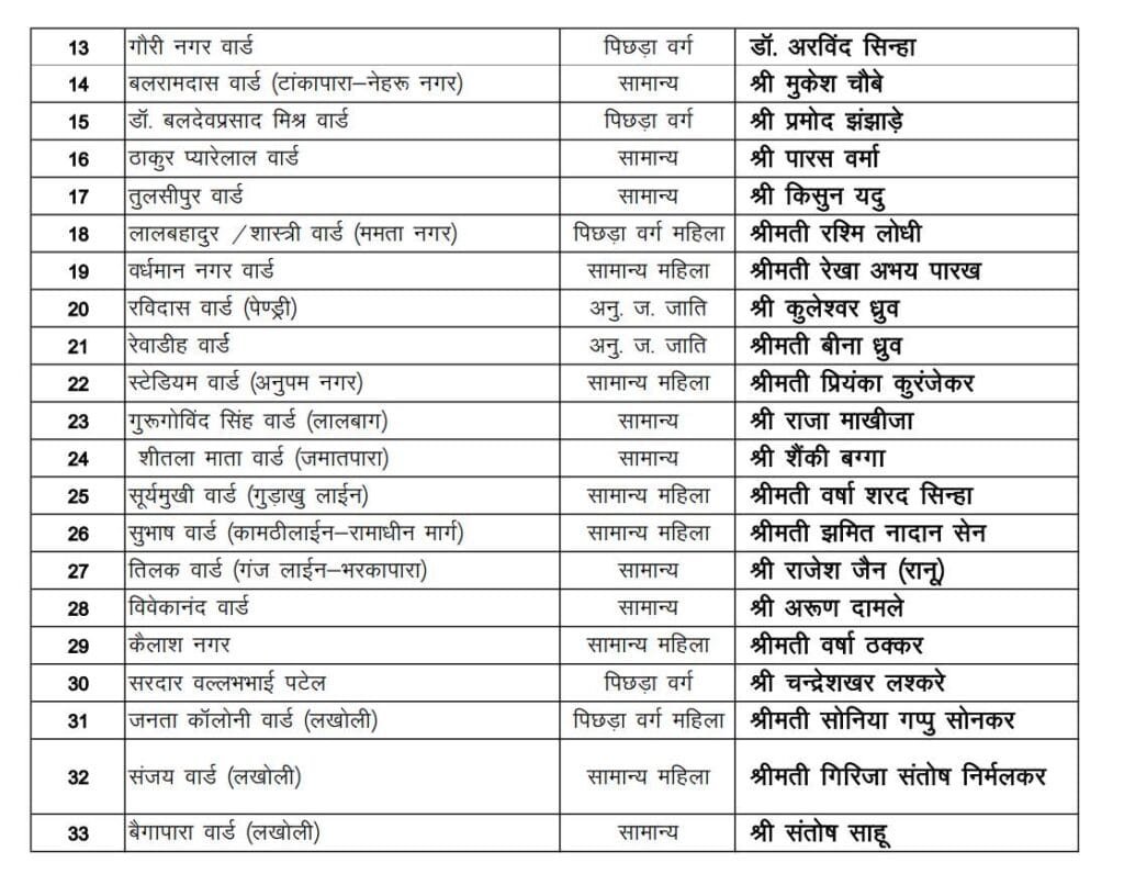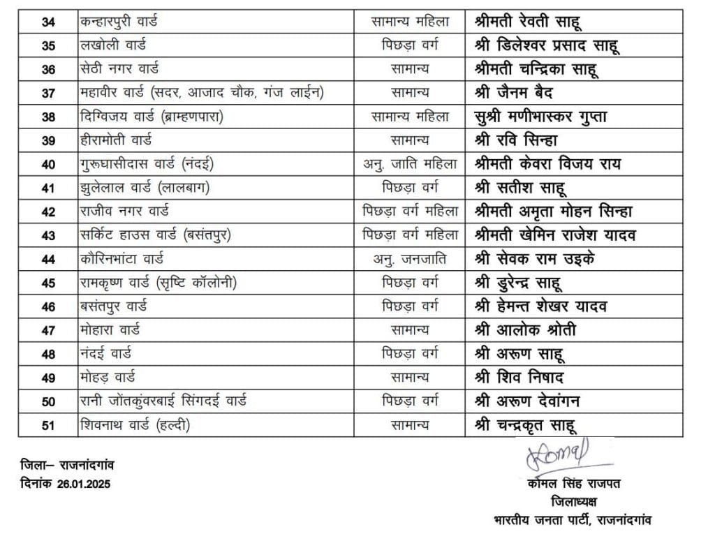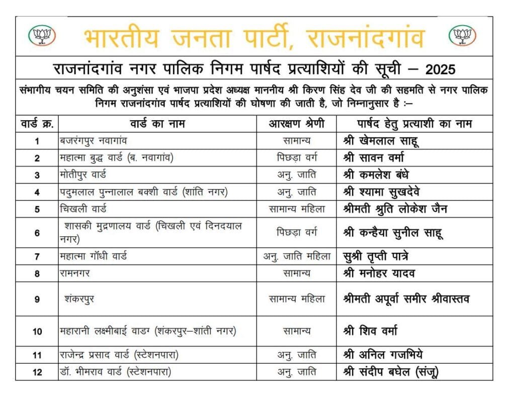 राजनांदगांव। छत्तीसगढ़ में आगामी नगरीय निकाय चुनाव के मद्देनजर बीजेपी (भारतीय जनता पार्टी) ने राजनांदगांव नगर निगम के सभी 51 वार्डों में अपने पार्षद प्रत्याशियों का ऐलान कर दिया है। रविवार की देर शाम पार्टी ने सभी 51 पार्षद प्रत्याशियों के नामों की लिस्ट जारी की है। जानिए पार्टी ने किस वार्ड से किस प्रत्याशी को मौका दिया है।