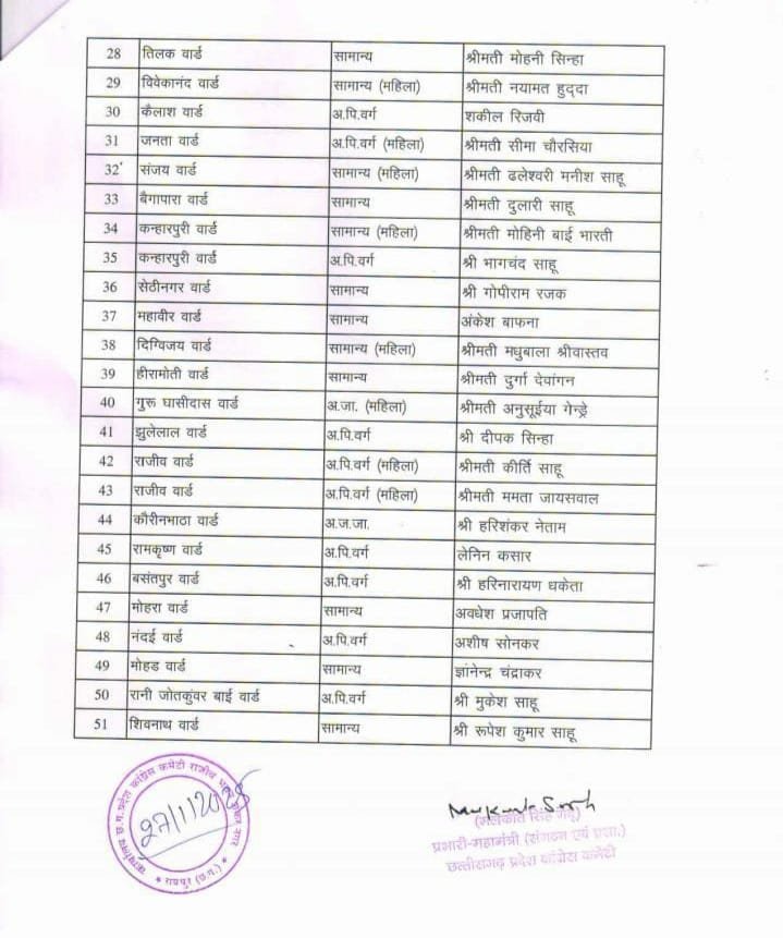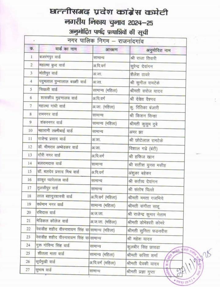 राजनांदगांव: नगर पालिका निगम राजनांदगांव के 51 वार्डों के लिए प्रदेश कांग्रेस कमेटी ने प्रत्याशियों की सूची जारी की है ।
