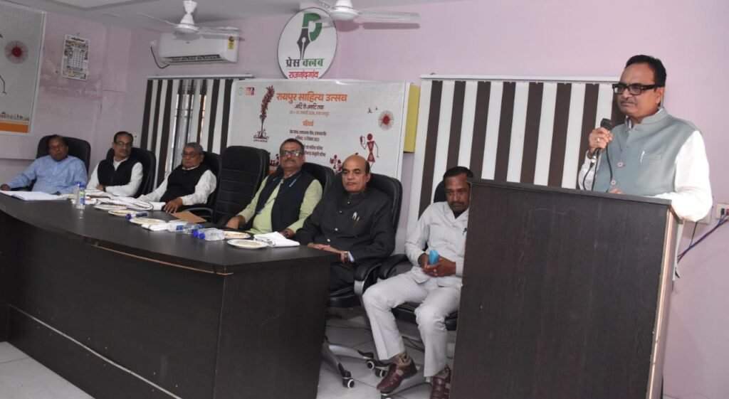 राजनांदगांव 13 दिसम्बर 2025। रायपुर साहित्य उत्सव : आदि से अनादि तक का आयोजन 23 जनवरी से 25 जनवरी 2026 तक नवा रायपुर में किया जा रहा है। इसी कड़ी में नांदगांव संस्कृति एवं साहित्य परिषद एवं साहित्य अकादमी छत्तीसगढ़़ संस्कृति परिषद द्वारा आज प्रेस क्लब में परिचर्चा का आयोजन किया गया। इस अवसर पर मुख्य अतिथि के तौर पर वरिष्ठ पत्रकार श्री सुशील कोठारी उपस्थित थे। साहित्य अकादमी के अध्यक्ष श्री शशांक शर्मा ने कार्यक्रम की अध्यक्षता की। इस दौरान विशिष्ट अतिथि के तौर पर पुरातत्वविद डॉ. आरएन विश्वकर्मा, विभागाध्यक्ष हिन्दी डॉ. शंकर मुनि राय एवं अन्य साहित्यकार उपस्थित रहे।