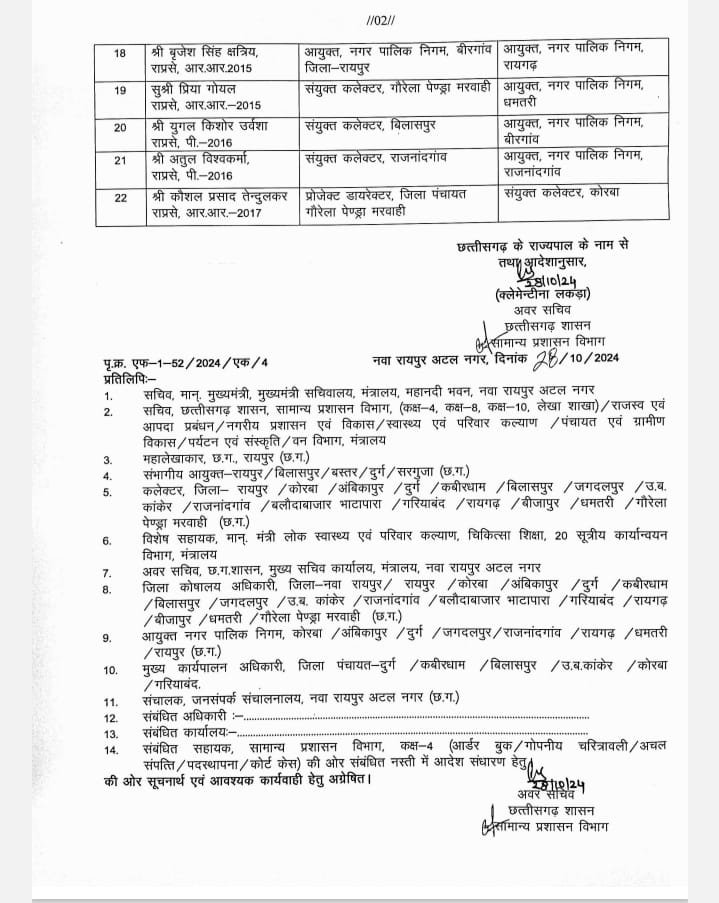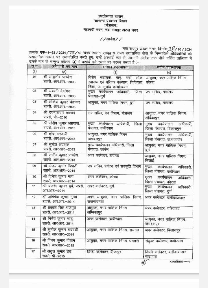कौशल प्रसाद तेंदुलकर को बनाया गया संयुक्त कलेक्टर कोरबा, की जिम्मेदारी सौंपा गया है। वहीं राजनांदगांव के वर्तमान नगर निगम आयुक्त अभिषेक गुप्ता को अपर कलेक्टर बलौदाबाजार की जिम्मेदारी सौंपी गई है। राजनांदगांव में पदस्थ sdm अतुल विश्वकर्मा को नगर निगम आयुक्त का प्रभार सौंपा गया है।