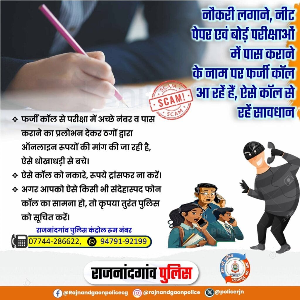 राजनांदगांव पुलिस की एडवायजरी- नौकरी लगाने, नीट पेपर एवं बोर्ड़ परीक्षाओं में पास कराने के नाम पर फर्जी कॉल आ रहें हैं, ऐसे कॉल से रहें सावधान
