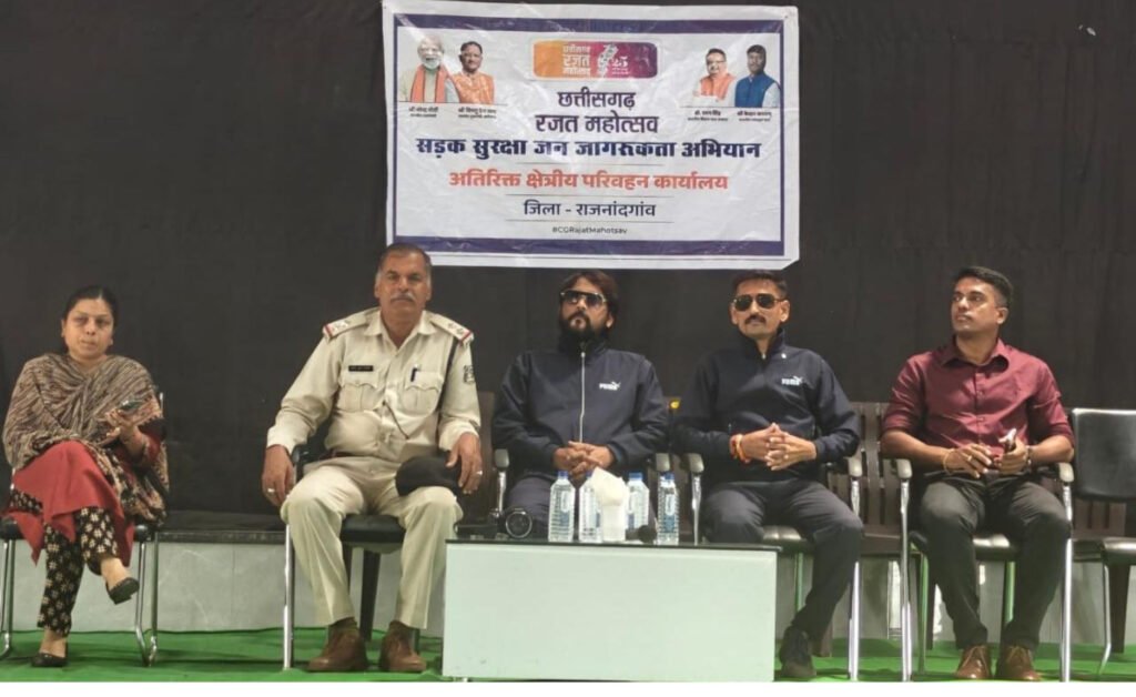 राजनांदगांव 12 अक्टूबर 2025। छत्तीसगढ़ रजत महोत्सव पर परिवहन विभाग द्वारा राजनांदगांव जिला आगमन पर विश्व शांति विश्व पदयात्री व रथयात्री, पर्वतारोही टीम के साथ यातायात, परिवहन, सड़क सुरक्षा पर नागरिकों को जागरूक किया गया। जागरूकता कार्यक्रम के तहत चौक-चौराहों पर मोटर सायकल चालकों को यातायात नियमों की जानकारी दी गई। साथ ही हेलमेट पहने चालकों को पुष्पगुच्छ देकर प्रोत्साहित किया गया। मोटरयान नियमों का उल्लंघन करने वाले को हार पहनाकर नियमों का पालन करने व मोटर सायकल चलाते समय हेलमेट पहनने की अपील की गई।