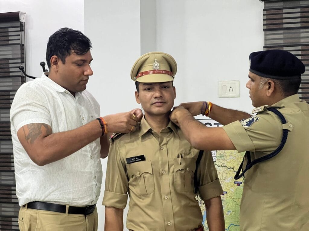पुलिस अधीक्षक श्री मोहित गर्ग द्वारा उप निरीक्षक संजय बरेठ को स्टार लगाकर निरीक्षक के पद पर पदोन्नत किया।