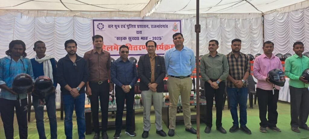 राजनांदगांव-  आज दिनांक 21.01.2025 को राष्ट्रीय सड़क सुरक्षा माह 2025 के दौरान पुलिस अधीक्षक श्री मोहित गर्ग के आव्हान पर नाथु नवागांव स्थित सन ग्रुप के चेयरमेन श्री सुनील अग्रवाल के सौजन्य से विभिन्न फैक्ट्रीयों मे ंकार्यरत मजदूरों को 300 नग हेलमेट वितरण किया गया।