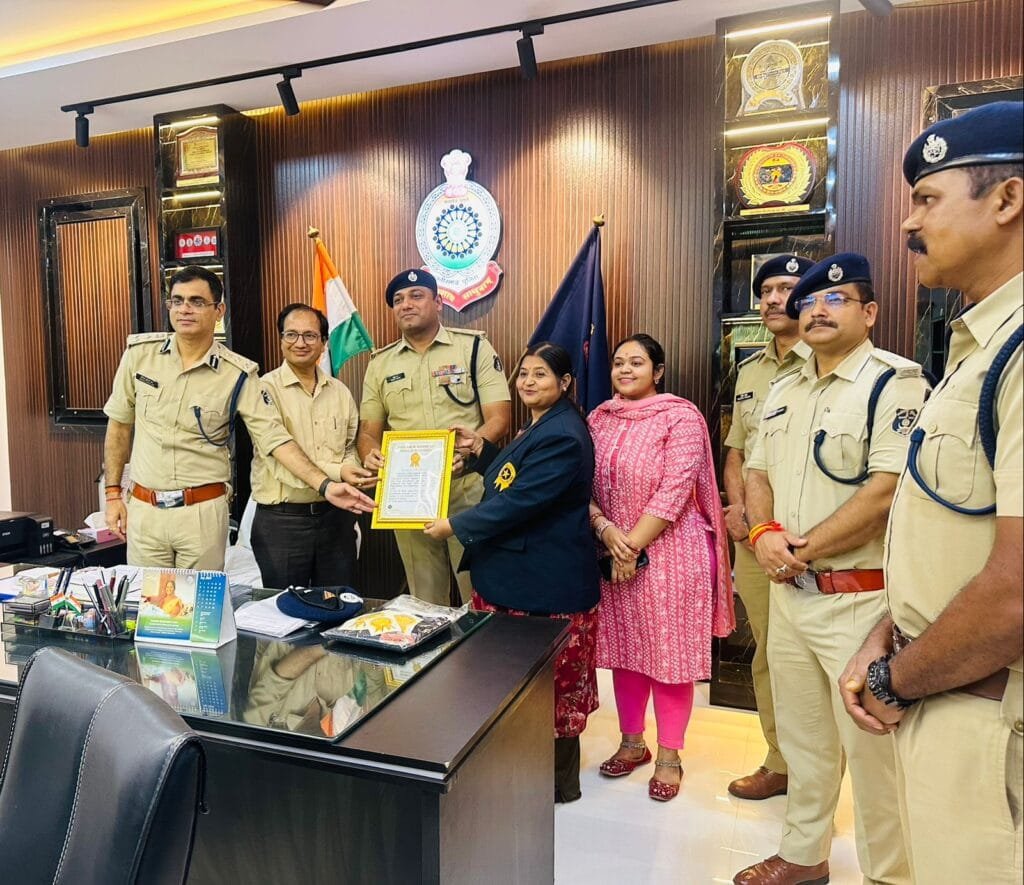 जिसका प्रशस्ति पत्र की प्रदेश प्रभारी श्रीमती सोनल राजेश शर्मा द्वारा दिया गया। प्रदेश प्रभारी श्रीमती सोनल राजेश शर्मा द्वारा जागरूकता कार्यक्रम का विजिट कर अभियान के सफलता पूर्वक समाप्ति पश्चात श्रीमती सोनल राजेश शर्मा द्वारा पुलिस महानिरीक्षक कार्यालय पहुंच कर पुलिस महानिरीक्षक महोदय श्री दीपक कुमार झा,