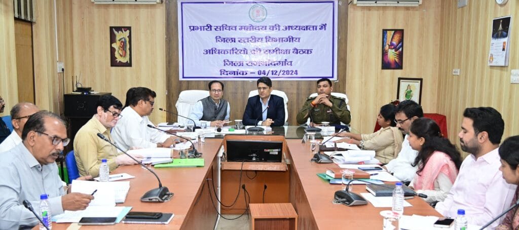राजनांदगांव 04 दिसम्बर 2024। जिले के प्रभारी सचिव श्री अविनाश चंपावत ने आज कलेक्टोरेट सभाकक्ष में सभी जिला स्तरीय अधिकारियों की बैठक लेकर जिले में विभिन्न विभागों द्वारा संचालित कार्यों एवं उनके प्रगति की समीक्षा की। इस दौरान कलेक्टर श्री संजय अग्रवाल एवं पुलिस अधीक्षक श्री मोहित गर्ग विशेष रूप से उपस्थित थे।