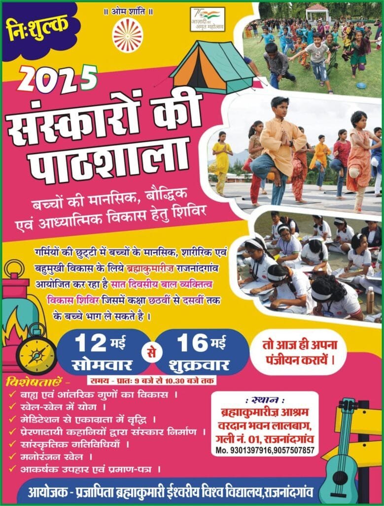 राजनांदगांव – प्रतिवर्षानुसार इस वर्ष भी प्रजापिता ब्रह्माकुमारी ईश्वरीय विश्व विद्यालय राजनांदगांव द्वारा 12 वर्ष से 16 वर्ष तक के आयु के बच्चों के लिए समर कैंप ” संस्कारों की पाठशाला” का आयोजन लालबाग स्थित ब्रह्माकुमारीज सेवाकेंद्र वरदान भवन में किया जा रहा है । इस आयोजन का मुख्य उद्देश्य बच्चों का शारीरिक मानसिक एवं बौद्धिक विकास के साथ साथ आध्यात्मिक रूप से सशक्त बनाना है ।