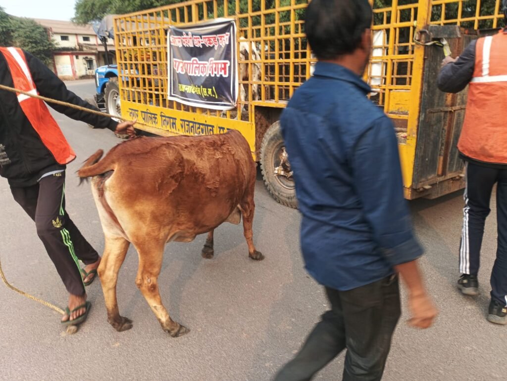 नगर निगम आयुक्त श्री अतुल विश्वकर्मा ने घुमन्तु मवेशियांे को पकड़ने टीम गठित की है, गठित टीम चौक चौराहो से घुमन्तु मवेशियों को पकड़ने की कार्यवाही कर रही है। आज की कार्यवाही में कमला कालेज रोड, आर.के.नगर, महावीर चौक, नया बस स्टैण्ड, लालबाग से 7 घुमन्तु बैठे मवेशियों को पकड़ा गया। मवेशियों को पकड़कर कांजी हाउस में रखा जाता है, जहॉ उन्हे पैरा कुट्टी के साथ साथ बसंतपुर गंज मण्डी सें बचे फल सब्जी प्रतिदिन लाकर खिलाया जा रहा है, ताकि उन्हे पौष्टिक आहार मिलता रहे, बीमार मवेशियो को गौशाला पिंजरापोल लेजाकर ईलाज भी कराय जाता है। साथ ही उन्हंे छोडने पर 570-570 रूपये संबंधित से अर्थदण्ड लेकर मवेशी छोडा जाता है।