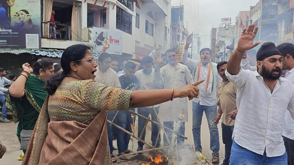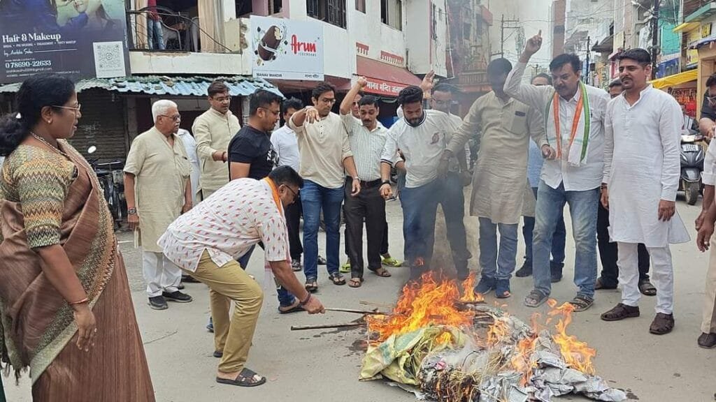 राजनांदगांव । राजनांदगांव शहर जिला कांग्रेस कमेटी द्वारा लोकसभा में बजट चर्चा के दौरान भारतीय जनता पार्टी के सांसद पूर्व केंद्रीय मंत्री अनुराग सिंह ठाकुर द्वारा लोकसभा में नेता प्रतिपक्ष राहुल गांधी के ऊपर की गई अमर्यादित,अलोकतांत्रिक टिप्पणी करने के विरोध में बीजेपी सांसद अनुराग सिंह ठाकुर का प्रतीकात्मक पुतला मानव मंदिर चौक में दहन किया गया जिसमें महापौर हेमा सुदेश देशमुख सहित कांग्रेस के नेता शामिल हुए।