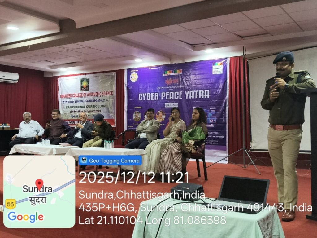 महावीर कॉलेज ऑफ आर्युवेदिक साइंस, जी.ई.रोड सुन्दरा राजनांदगांव में बी.ए.एम.एस. फस्टईयर के छात्रों के लिए इंडक्शन प्रोग्राम के तहत जीतो राजनांदगांव लेडीज विंग के द्वारा ‘‘साइबर पीस यात्रा’’ नामक साइबर जागरूकता कार्यक्रम का आयोजन दिनांक 12.11.2025 को किया गया। उक्त कार्यक्रम में मुख्य अतिथि के रूप में पुलिस अधीक्षक राजनांदगांव सुश्री अंकिता शर्मा तथा अतिरिक्त पुलिस अधीक्षक राजनांदगांव श्री राहुलदेव शर्मा एवं नगर पुलिस अधीक्षक राजनांदगांव श्रीमती वैशाली जैन को आमंत्रित किया गया था।