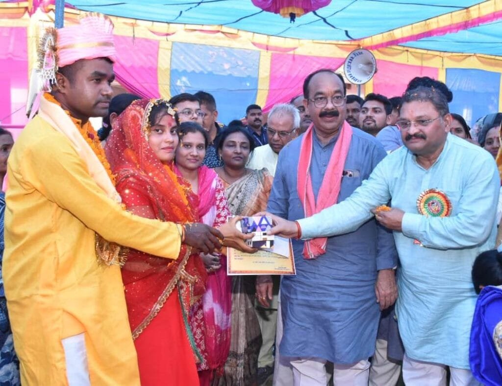 आयुष्मान भारत योजना के तहत नि:शुल्क ईलाज मरीजों को मिल रहा है। माता-पिता की चिंता को दूर करने में मुख्यमंत्री सामूहिक कन्या विवाह योजना कारगर साबित हुई है। गरीब माता-पिता के लिए अपने बच्चों का विवाह करना आसान हो गया है। उन्होंने कहा कि सामूहिक विवाह पुण्य का कार्य है और विष्णु का सुशासन कल्याणकारी है। उन्होंने कहा कि सभी माता-बहनों को महतारी वंदन योजना के तहत उनके बैंक खाते में प्रतिमाह 1000 रूपए की राशि प्राप्त हो रही है। जहां माता का सम्मान होता है, वहां लक्ष्मी, सुख-समृद्धि एवं शांति आती है। प्रधानमंत्री श्री नरेन्द्र मोदी जनसामान्य को नि:शुल्क चावल दे रहे हंै, जिससे गरीब एवं जरूरतमंदों के जीवन का उन्नयन हुआ है।