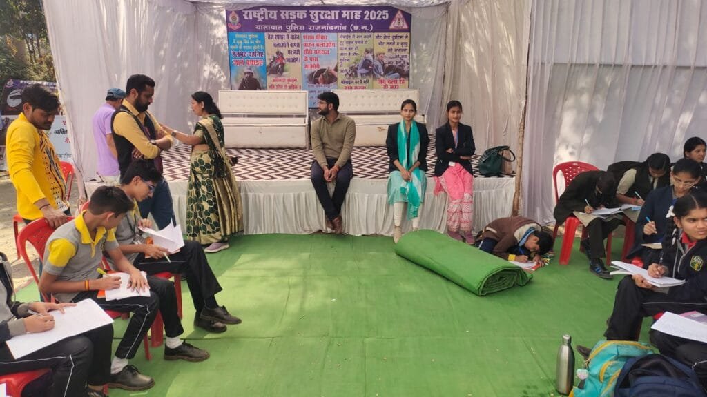 राजनांदगांव / राष्ट्रीय सड़क सुरक्षा माह के बाइसवें दिन पुलिस अधीक्षक श्री मोहित गर्ग के निर्देशन एवं अति.पुलिस अधीक्षक श्री राहुल देव शर्मा के मार्गदर्शन में र.नि. अरविंद साहू, निरी. अजय खेस एवं यातायात टीम की उपस्थिति में यातायात कार्यालय राजनांदगांव में प्रातः 10ः00 से 13ः00 बजे तक ‘‘निबंध प्रतियोगिता’’ विषय- ‘‘बढ़ते सड़क हादसों के कारण और निदान’’ का आयोजन किया गया। जिसमें शहर के सरस्वती विद्या मंदिर, रॉयल किड्स कॉन्वेंट, गायत्री विद्यापीठ, एकलव्य स्कूल पेण्ड्री, गुजराती स्कूल, अजीज पब्लिक स्कूल एवं दिल्ली पब्लिक स्कूल के 84 प्रतिभागी सम्मिलित हुये।