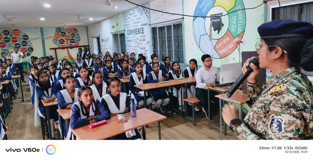 पुलिस अधीक्षक महोदया सुश्री अंकिता शर्मा के निर्देशन में दिनांक 15 दिसंबर 2025 को शासकीय उच्च माध्यमिक शाला हल्दी, राजनांदगांव में कक्षा 9वीं से 12वीं तक की छात्राओं हेतु महिला सुरक्षा जागरूकता कार्यक्रम आयोजित किया गया।
