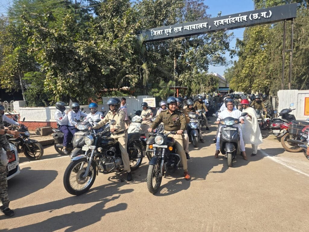 राजनांदगांव/ दिनांक 27.01.2025 को राष्ट्रीय सड़क सुरक्षा माह के 27वें दिन जिला न्यायालय से हेलमेट जन-जागरूकता बाईक रैली का आयोजन किया गया जिसमें प्रधान जिला सत्र न्यायाधीश श्रीमति सुषमा सांवत, कलेक्टर श्री संजय अग्रवाल, पुलिस अधीक्षक श्री मेहित गर्ग, एडीजे श्री डी.आर. देवांगन, श्री ओमप्रकाश साहू एवं अन्य न्यायिक अधिकारीगण, नगर पुलिस अधीक्षक श्री पुष्पेन्द्र नायक, यातायात प्रभारी श्री अजय खेस एवं अन्य पुलिस कर्मचारी उपस्थित थे। हेलमेट जन जागरूकता रैली न्यायालय परिसर से प्रारंभ होकर प्यारेलाल चौक, गुरूनानक चौक, मानव मंदिर चौक, जय स्तंभ चौक, महावीर चौक नया बस स्टैण्ड चौक, अम्बेडकर चौक से हेते हुए जिला न्यायालय राजनांदगांव पहुंचकर समापन हुआ।