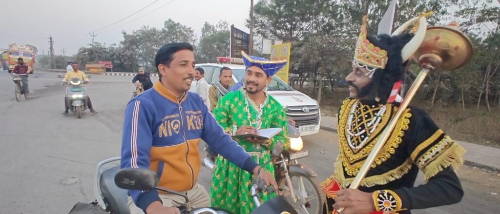 राजनांदगांव। सड़क सुरक्षा माह के दौरान आज दिनांक 14.01.2026 को सुश्री अंकिता शर्मा पुलिस अधीक्षक राजनांदगांव के निर्देशन में एवं श्री पुष्पेन्द्र नायक अतिरिक्त पुलिस अधीक्षक राजनांदगांव के मार्गदर्शन में यातायात टीम एवं यमराज एवं चित्रगुप्त नाटकीय किरदार एवं संवादो के माध्यम से विनोद गौतम एवं टेकराम द्वारा नेशनल हाईवे एवं शहर के महावीर चौक में बिना सीट बेल्ट, दुपहिया वाहन चलाते समय बिना हेलमेट, तीन सवारी चलने वाले वाहन चालकों यातायात संबंधी जागरूकता अभियान चलाकर यातायात नियमों का पालन करने अपील किया गया।