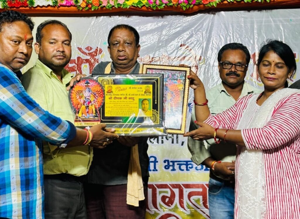 राजनांदगांव । शहर के नगर निगम वार्ड नंबर 35 निवासी पत्रकार दीपक साहू को लंबे समय से पत्रकारिता के क्षेत्र में विशिष्ट सेवाएं देने के लिए शहर के प्रतिष्ठित धार्मिक संस्था श्री सिद्धि विनायक अंबे धाम गणेश मंदिर जनता कॉलोनी वार्ड क्रमांक 31 लखोली द्वारा उन्हें मेमोंटो और गणेश भगवान का चित्र प्रदान कर सम्मानित किया गया है।