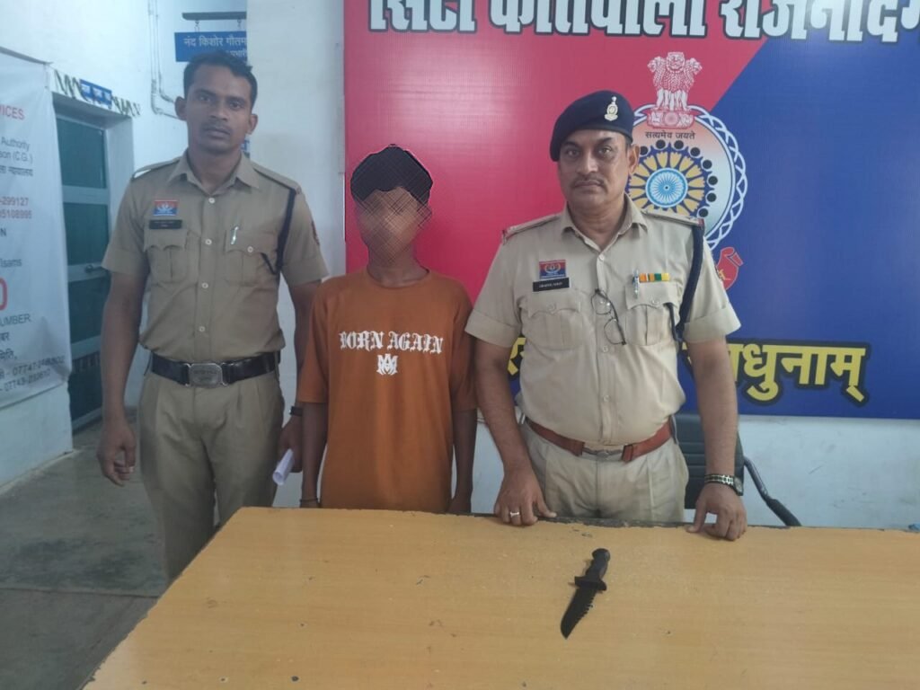 इसी दौरान, पुलिस को मुखबिर से सूचना मिली कि बीएनसी मील चाल, राम मंदिर के पास एक युवक हाथ में चाकू लेकर आने-जाने वालों को डराने-धमकाने की हरकत कर रहा है। सूचना पर पुलिस टीम ने मौके पर पहुंचकर आरोपी कृष्णा बंसोड़ पिता स्व. ईश्वर बंसोड़ (उम्र 18 वर्ष 9 माह), निवासी बख्तावर चाल गली नं. 01, तुलसीपुर, थाना कोतवाली राजनांदगांव (छ.ग.) को घेराबंदी कर पकड़ा।