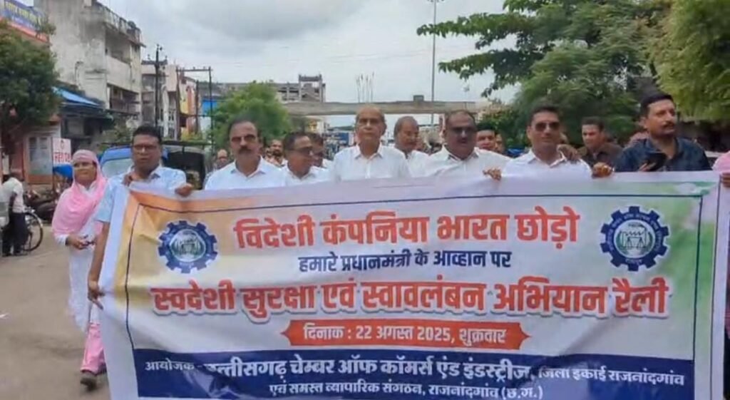 राजनांदगांव। प्रधानमंत्री नरेंद्र मोदी के आत्मनिर्भर भारत के आह्वान पर शुक्रवार को राजनांदगांव चेंबर ऑफ कॉमर्स ने शहर में स्वदेशी जागरूकता रैली का आयोजन किया। चेंबर ऑफ कॉमर्स के प्रदेश अध्यक्ष सतीश थौरानी के निर्देश एवं जिला अध्यक्ष कमलेश बैद के नेतृत्व में यह रैली गंज लाइन बालाजी मंदिर से प्रारंभ होकर भारत माता चौक, रामाधीन मार्ग, कामठी लाइन, जयस्तंभ चौक और मानव मंदिर चौक होते हुए गंज चौक में संपन्न हुई।