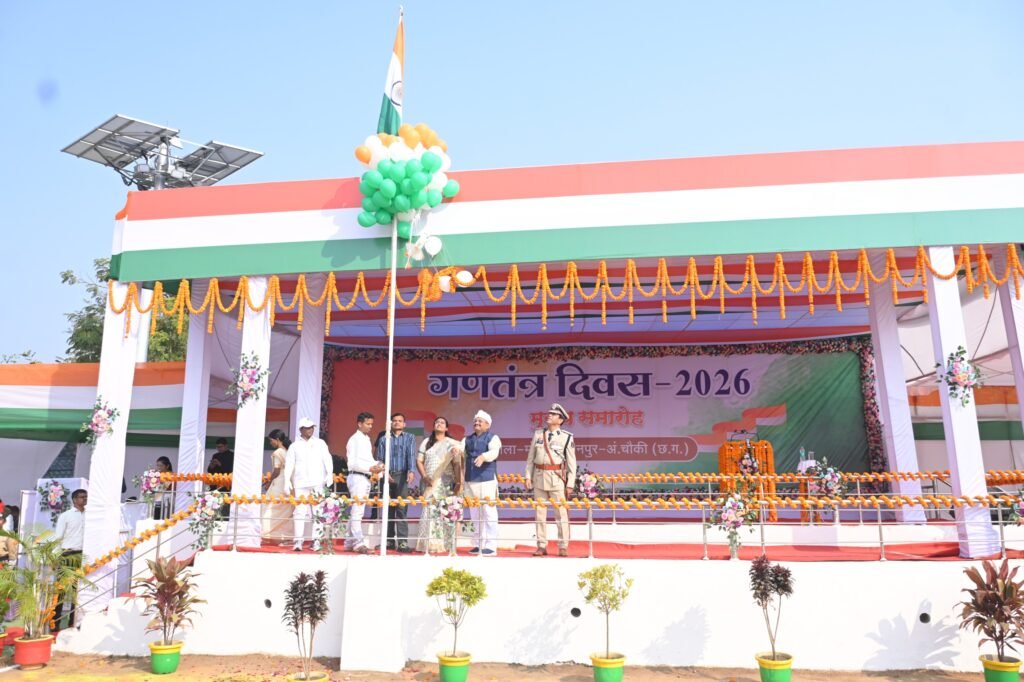मोहला 26 जनवरी 2026। जिले में 77 वां गणतंत्र दिवस हर्ष एवं उल्लास के साथ मनाया गया। जिला मुख्यालय के मिनी स्टेडियम में आयोजित मुख्य समारोह में सांसद लोकसभा क्षेत्र राजनांदगांव श्री संतोष पाण्डेय ने झंडा फहराया। इसके पश्चात राष्ट्रगान का गायन किया गया व बटालियन, पुलिस बल, एनसीसी कैडेट्स व स्काउट गाईड्स की टुकडिय़ा द्वारा सलामी दी गई। सांसद लोकसभा राजनांदगांव श्री संतोष पाण्डेय ने शांति के प्रतीक श्वेत कपोत तथा तिरंगे गुब्बारे आकाश में उड़ाये। इस मौके पर सांसद लोकसभा राजनांदगांव श्री संतोष पाण्डेय ने मुख्यमंत्री के जनता के नाम संदेश का वाचन किया।
