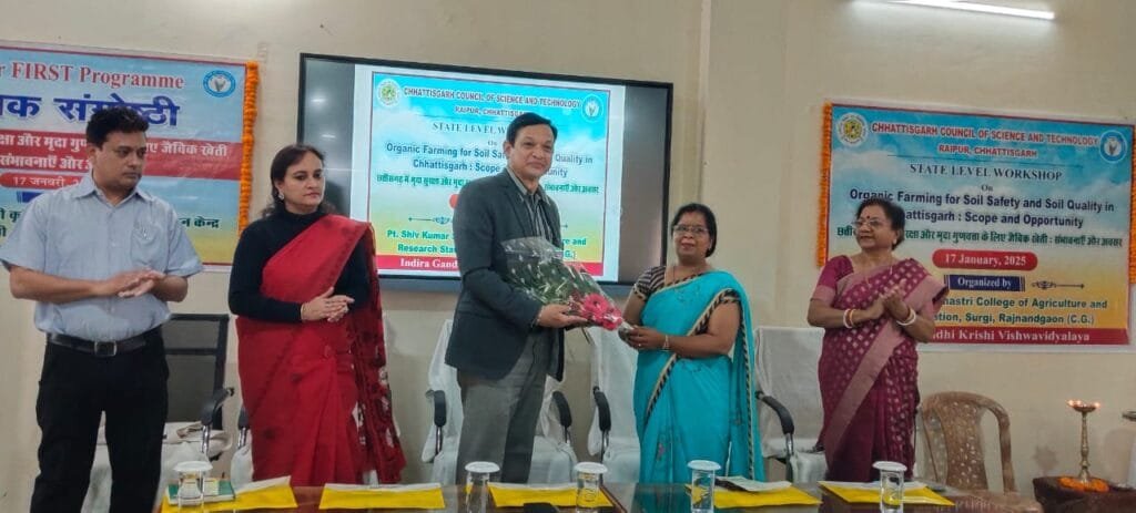 रायपुर / आज दिनांक 17.01.2025 को छत्तीसगढ़ विज्ञान एवं प्रौद्योगिकी एवं पं.शिव कुमार शास्त्री कृषि महाविद्यालय एवं अनुंसधान केन्द्र, सुरगी, राजनांदगांव के संयुक्त तत्वाधान में का एक दिवसीय कृषक संगोष्ठि एवं राज्य स्तरीय कार्यशाला का आयोजन डॉ. अखिलेश त्रिपाठी, वैज्ञानिक, छत्तीसगढ़ विज्ञान एवं प्रौद्योगिकी परिषद, रायपुर के सफल मार्गदर्शन में संपन्न किया गया । कार्यशाला का आयोजन ”छत्तीसगढ़ में मृदा सुरक्षा और मृदा गुणवत्ता के लिए जैविक खेती: संभावनायें और अवसर“ विषय पर किया गया। उक्त कार्यक्रम में केन्द्र वित पोषित फामर्स फस्ट परियोजना के तहत दूरस्थ अंचल अम्बागढ चौकी विकासखण्ड के ग्रामों जैसे खुर्सीपार, मुरेठीटोला के कृषक बंधुओं को प्रशिक्षण प्रदान किया गया ।