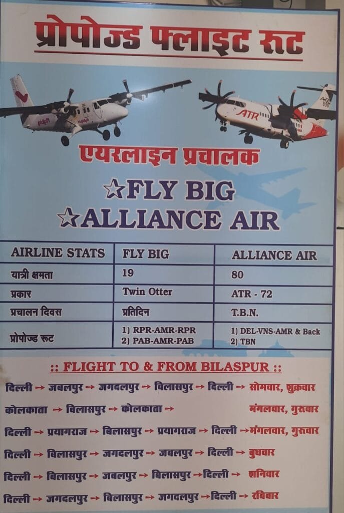 →बिलासपुर→दिल्ली के लिए उड़ान भरना प्रस्तावित है l इसी प्रकार मंगलवार, गुरुवार को अंबिकापुर से→ कोलकाता→बिलासपुर → कोलकाता से,*मंगलवार, गुरुवार को अंबिकापुर से→ दिल्ली → प्रयागराज → बिलासपुर→ प्रयागराज →दिल्ली के लिए उड़ान भरना प्रस्तावित है l