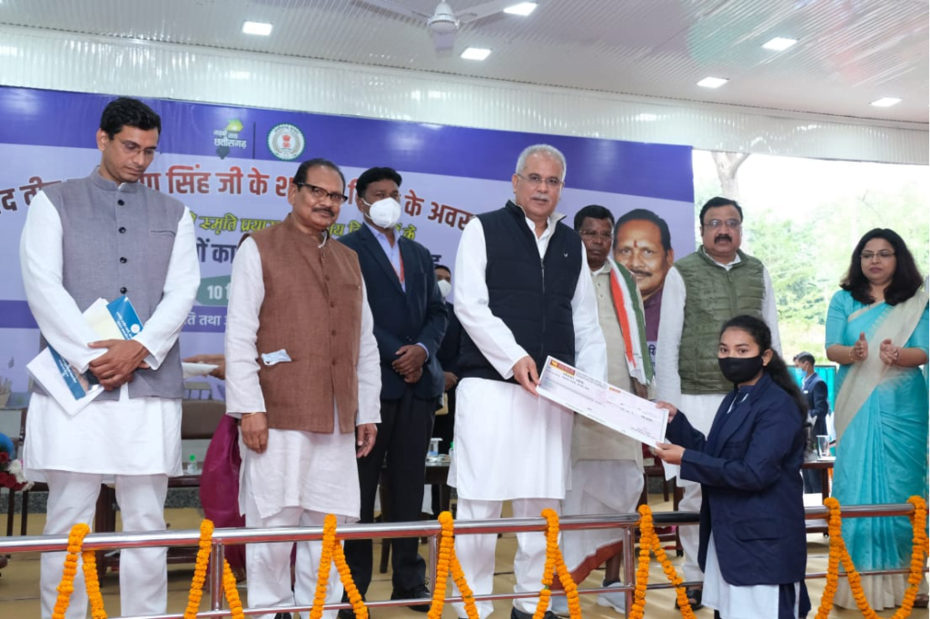 रायपुर, 10 दिसम्बर 2021 मुख्यमंत्री श्री भूपेश बघेल ने आज यहां पर निवास कार्यालय में महान स्वतंत्रता संग्राम सेनानी शहीद वीर नारायण सिंह के शहादत दिवस पर आयोजित प्रतिभा सम्मान समारोह में स्वर्गीय राजीव गांधी स्मृति प्रयास आवासीय विद्यालय के प्रतिभावान विद्यार्थियों को सम्मानित किया। प्रयास आवासीय विद्यालय में नक्सल पीड़ित जिलों और अनुसूचित क्षेत्रों के अध्ययनरत प्रतिभावान विद्यार्थियों ने अपनी प्रतिभा के दम पर आईआईटी, एन.आई.टी., इंजीनियरिंग, मेडिकल, सी.एस. सी.ए.फाउंडेशन, सीएमए, नेशनल लॉ कॉलेज के पाठ्यक्रमों के लिए देश के प्रतिष्ठित शैक्षणिक संस्थानों में प्रवेश प्राप्त किया है।