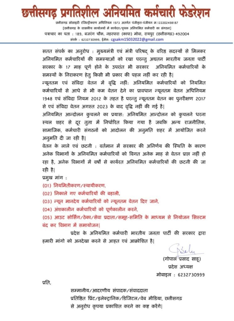 रायपुर। छत्तीसगढ़ अनियमित कर्मचारी फेडरेशन छत्तीसगढ़ प्रदेश के शासकीय कार्यालयों में कार्यरत अनियमित कर्मचारियों के नियमितीकरण/स्थायीकरण, निकाले गए कर्मचारियों की बहाली, न्यून मानदेय कर्मचारियों को न्यूनतम वेतन दिए जाने, अंशकालीन कर्मचारियों को पूर्णकालीन करने, आउट सोर्सिंग/ठेका/सेवा प्रदाता/समूह-समिति के माध्यम से नियोजन सिस्टम बंद करने सहित विभिन्न मांगो पर सरकार की अनदेखी से आहत है तथा मांगो के लिए दिसम्बर में विशाल प्रदर्शन का आयोजन करेगा| उक्ताशय का निर्णय विगत दिवस फेडरेशन की आयोजित बैठक में लिया गया|