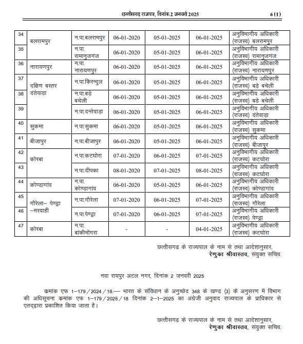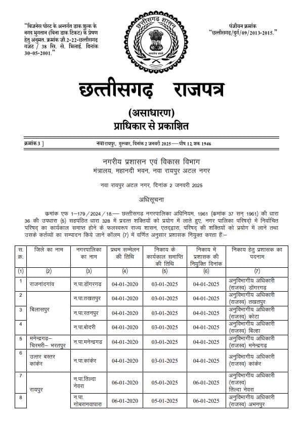 रायपुर- राज्य सरकार ने प्रदेश के 47 नगर पालिकाओं में प्रशासकों की नियुक्ति की अधिसूचना राजपत्र में प्रकाशित कर दी है.