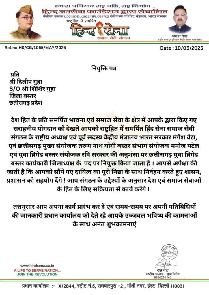 राष्ट्रीय राजधानी,नई दिल्ली देशहित के प्रति समर्पित भावना एवं समाजसेवा के क्षेत्र में किए गए सराहनीय योगदान को देखते हुए हिन्द सेना समाजसेवी संगठन के राष्ट्रीय अध्यक्ष एवं पूर्व सदस्य केंद्रीय मंत्रालय भारत सरकार मंगेश वैद्य,छत्तीसगढ़ मुख्य संयोजक तरुणानाथ योगी,बस्तर संयोजक मनोज पटेल,युवा ब्रिगेड बस्तर संयोजक रवि सरकार की अनुशंसा पर युवा ब्रिगेड राष्ट्रीय अध्यक्ष दक्ष वैद्य ने युवा समाजसेवी दिलीप गुहा को युवा ब्रिगेड बस्तर कार्यकारी जिलाध्यक्ष पद पर नियुक्त किया है। युवा ब्रिगेड राष्ट्रीय अध्यक्ष दक्ष वैद्य ने नवनियुक्त कार्यकारी जिलाध्यक्ष दिलीप गुहा को देशहित में समाजसेवा के क्षेत्र में अग्रसर रहने के निर्देश दिए।कार्यकारी जिलाध्यक्ष दिलीप गुहा ने नियुक्त किये जाने पर राष्ट्रीय अध्यक्ष मंगेश वैद्य,युवा ब्रिगेड राष्ट्रीय अध्यक्ष दक्ष वैद्य,
