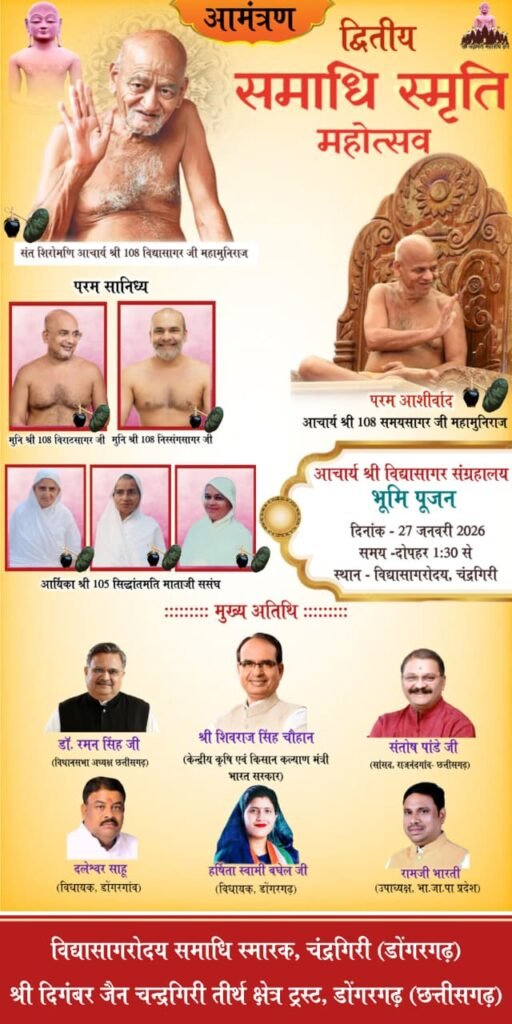 रायपुर आगमन के पश्चात वे 12.25 बजे हेलीकॉप्टर से राजनांदगांव जिले के डोंगरगढ़ स्थित हेलीपैड के लिए प्रस्थान करेंगे और 12.55 बजे वहां पहुंचेंगे। इसके बाद वे कार द्वारा प्रतिभास्थली स्कूल परिसर पहुंचेंगे। दोपहर 1.30 बजे से 4.45 बजे तक श्री चौहान ऑल इंडिया विश्वगुरु जैनाचार्य विद्यासागर समाधि स्मृति महोत्सव में सहभागिता करेंगे।
