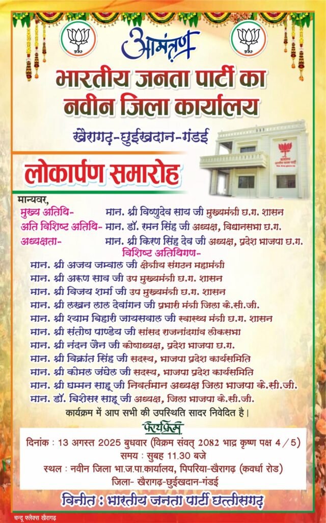 खैरागढ़-छुईखदान-गंडई। भारतीय जनता पार्टी के नवीन जिला कार्यालय का लोकार्पण समारोह 13 अगस्त 2025, बुधवार को आयोजित किया जाएगा। यह कार्यक्रम सुबह 11:30 बजे पिपरिया-खैरागढ़ (कवर्धा रोड) स्थित नवीन जिला भाजपा कार्यालय में होगा।