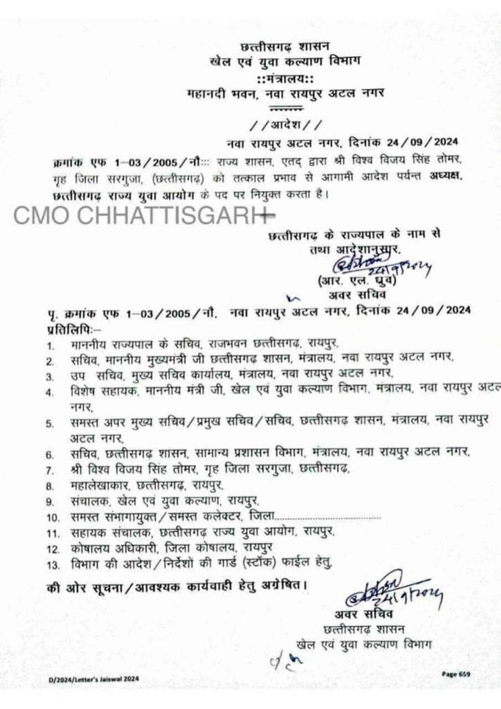 खेल एवं युवा कल्याण विभाग ने इस संबंध में आदेश जारी किया है. बता दें कि विश्व विजय सिंह वर्त्तमान में भारतीय जनता युवा मोर्चा सरगुजा के जिलाध्यक्ष हैं.